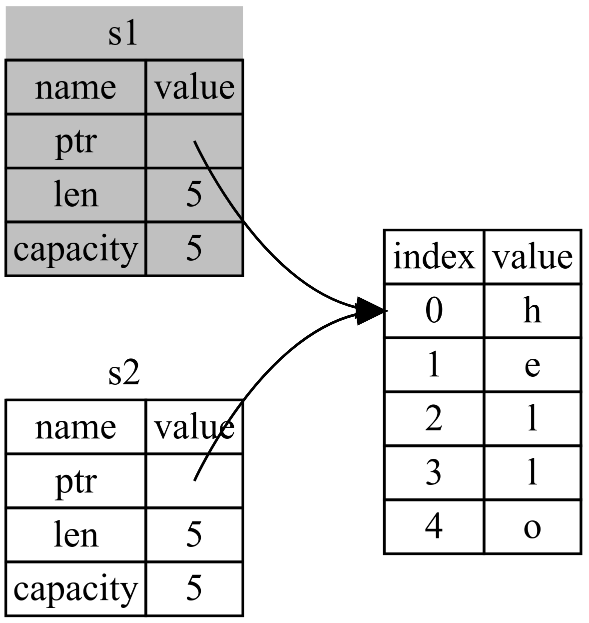 # 所有权 所有运行的程序都必须管理其使用计算机内存的方式。 有些语言具有垃圾回收机制,在程序运行时不断地寻找不再使用的内存(比如Java); 有些语言中,程序员必须亲自分配和释放内存(C/C++)。 Rust 则选择了第三种方式:通过所有权系统管理内存,编译器在编译时会根据一系列的规则进行检查。在运行时,所有权系统的任何功能都不会减慢程序。 ## 所有权规则 首先,让我们看一下所有权的规则。当我们通过举例说明时,请谨记这些规则: 1. Rust 中的每一个值都有一个被称为其 **所有者(owner)**的变量。 2. 值在**任一时刻**有且**只有一个所有者**。 3. 当**所有者(变量)离开作用域**,这个**值将被丢弃**。 ## 变量作用域 - 当 变量 **进入作用域** 时,它就是有效的。 - 这一直持续到它 **离开作用域** 为止。 ## 内存与分配 ```rust #![allow(unused)] fn main() { { let s = String::from("hello"); //从此处起,s 是有效的 // 使用 s } // 此作用域已结束, // s 不再有效 } ``` 对于 String 类型,为了支持一个可变,可增长的文本片段,需要在堆上分配一块在编译时未知大小的内存来存放内容。这意味着: - 必须在运行时向操作系统请求内存。 需要一个当我们处理完 String - 时将内存返回给操作系统的方法。 第一部分由我们完成:当调用 String::from 时,它的实现 (implementation) 请求其所需的内存。这在编程语言中是非常通用的。 第二部分 Rust 采取了一个不同的策略:内存在拥有它的变量离开作用域后就被自动释放。当变量离开作用域,`Rust` 为我们调用一个特殊的函数。这个函数叫做 `drop`,在这里 `String` 的作者可以放置释放内存的代码。Rust 在结尾的 `}` 处自动调用 `drop`。 > 注意:在 C++ 中,这种 item 在生命周期结束时释放资源的模式有时被称作 资源获取即初始化(Resource Acquisition Is Initialization (RAII))。如果你使用过 RAII 模式的话应该对 Rust 的 drop 函数并不陌生。 *个人理解:drop相当于C++里面的析构函数。* ## 变量与数据交互的方式 ```rust #![allow(unused)] fn main() { let x = 5; let y = x; } ``` 对于已知固定大小的简单值,行为是拷贝,现在有了两个变量,x 和 y,都等于 5。 ### 移动 ```rust #![allow(unused)] fn main() { let s1 = String::from("hello"); let s2 = s1; println!("{}, world!", s1); } ``` 你会得到一个类似如下的错误,因为 Rust 禁止你使用无效的引用。 error[E0382]: use of moved value: `s1` --> src/main.rs:5:28 | 3 | let s2 = s1; | -- value moved here 4 | 5 | println!("{}, world!", s1); | ^^ value used here after move | = note: move occurs because `s1` has type `std::string::String`, which does not implement the `Copy` trait String 由三部分组成:一个指向存放字符串内容内存的指针,一个长度,和一个容量。这一组数据存储在栈上。指针指向堆上存放内容的内存。 用C++表示就是: ```C++ class String { char* content; uint32 len; uint32 capacity; } ``` 当执行`let s2 = s1;`时,Rust则认为s1不再有效,s2的指针直接指向s1的堆上内存。 这个行为很像C++中的 浅拷贝(shallow copy)。**不过因为 Rust 同时使第一个变量无效**了,这个操作被称为 **移动(move)**,而不是浅拷贝。上面的例子可以解读为 s1 被 移动 到了 s2 中。  > Rust 永远也不会自动创建数据的 “深拷贝”。因此,任何 自动 的复制可以被认为对运行时性能影响较小。 ### 克隆 如果我们 确实 需要深度复制 String 中堆上的数据,而不仅仅是栈上的数据,可以使用一个叫做 **clone** 的通用函数。 ```rust #![allow(unused)] fn main() { let s1 = String::from("hello"); let s2 = s1.clone(); println!("s1 = {}, s2 = {}", s1, s2); } ``` # 引用 ## 引用与借用 ```rust fn main() { let s1 = String::from("hello"); let len = calculate_length(&s1); println!("The length of '{}' is {}.", s1, len); } fn calculate_length(s: &String) -> usize { // s 是对 String 的引用 s.len() } // 这里,s 离开了作用域。但因为它并不拥有引用值的所有权, // 所以什么也不会发生 ``` `&` 符号就是 引用,它们允许你使用值但不获取其所有权。 与使用 `&` 引用相反的操作是 解引用(dereferencing),它使用解引用运算符,`*`。 变量 s 有效的作用域与函数参数的作用域一样,不过当引用离开作用域后并不丢弃它指向的数据,因为我们没有所有权。 *我们将获取引用作为函数参数称为 **借用**(borrowing)* ## 可变引用 ```rust fn main() { let mut s = String::from("hello"); change(&mut s); } fn change(some_string: &mut String) { some_string.push_str(", world"); } ``` 将 `s` 改为 `mut`。然后必须创建一个可变引用 `&mut s` 和接受一个可变引用 `some_string: &mut String` 不过可变引用有一个很大的限制:**在特定作用域中的特定数据*只能有一个可变引用*, 也*不能*在拥有不可变引用的同时拥有可变引用。** ```rust let mut s = String::from("hello"); let r1 = &mut s; let r2 = &mut s; println!("{}, {}", r1, r2); ``` 编译将报错: ``` error[E0499]: cannot borrow `s` as mutable more than once at a time --> src/main.rs:5:14 | 4 | let r1 = &mut s; | ------ first mutable borrow occurs here 5 | let r2 = &mut s; | ^^^^^^ second mutable borrow occurs here 6 | 7 | println!("{}, {}", r1, r2); | -- first borrow later used here ``` ## 悬垂引用(Dangling References) ```rust fn main() { let reference_to_nothing = dangle(); } fn dangle() -> &String { // dangle 返回一个字符串的引用 let s = String::from("hello"); // s 是一个新字符串 &s // 返回字符串 s 的引用 } // 这里 s 离开作用域并被丢弃。其内存被释放。 // 危险! ``` 这里是错误: error[E0106]: missing lifetime specifier --> main.rs:5:16 | 5 | fn