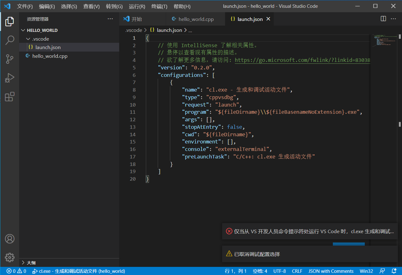 创建好了之后,选择hello.cpp标签页,再次使用Ctrl+F5快捷键。其实会报错,把命令cl.exe /Zi /EHsc /nologo /Fe: C:\Users\Square\Code\vs_code\hello_world\hello_world.exe C:\Users\Square\Code\vs_code\hello_world\hello_world.cpp复制出来到cmd执行以下,不难发现是cl.exe找不到。这就引出最后一步了